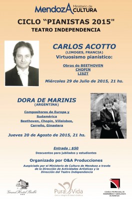 Carlos Acotto, pianista nacido en Rosario-Argentina, residente en Paris y profesor de piano en el Conservatorio de Limoges. Será presentado por Dora De Marinis el día miércoles 29 de julio a las 21 hs. en el Teatro Independencia de la Ciudad de Mendoza.
